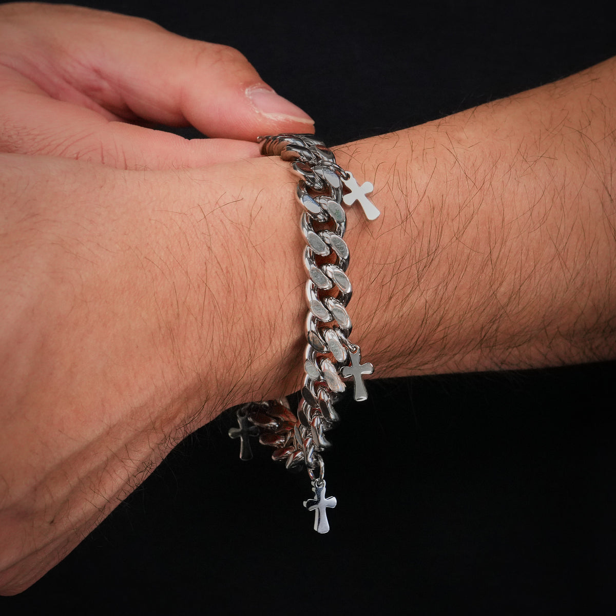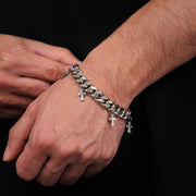 A bold echo to the Magnus necklace, this heavyweight bracelet brings the same commanding energy to the wrist. With five evenly spaced cross pendants dancing from a polished 10mm Cuban chain, it balances power and symbolism in every link. The integrated elongated link segment allows flexible sizing, while adding contrast and structure to the overall silhouette.
