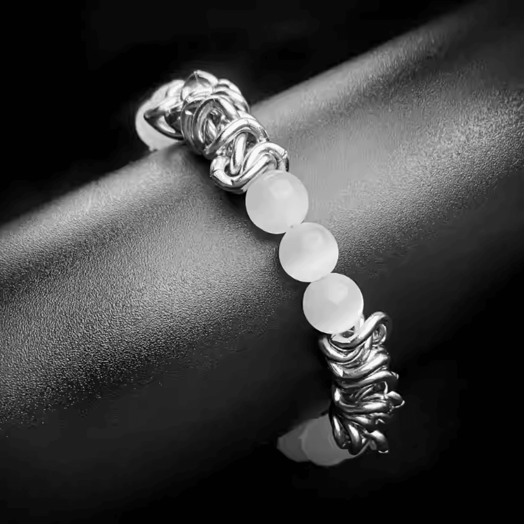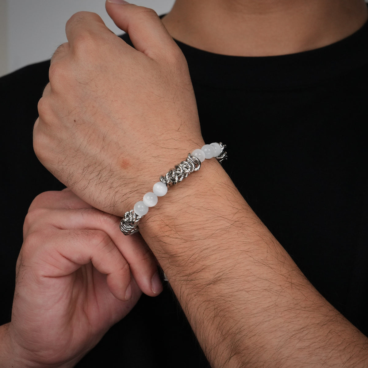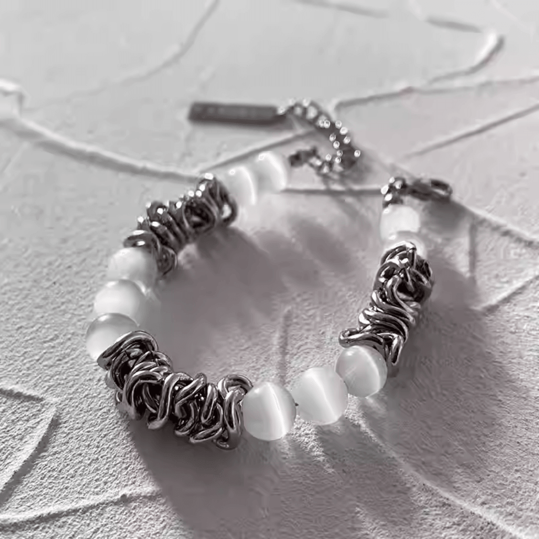 Albus is a tactile piece that plays on contrast — combining soft, moonlit cat’s eye beads with thorn-like clusters of stainless steel. The result is a bold yet poetic bracelet that channels organic strength and quiet rebellion.