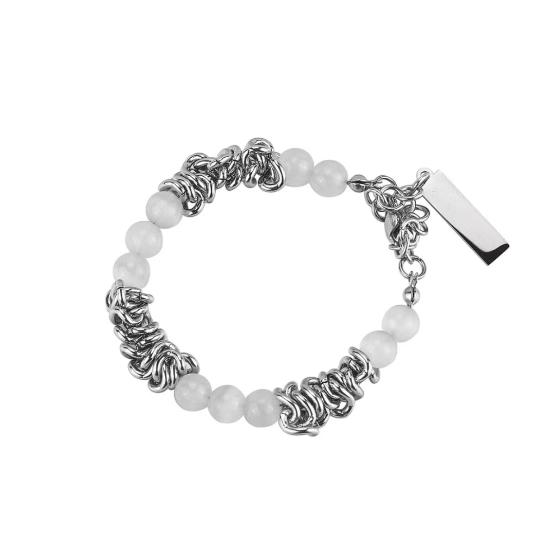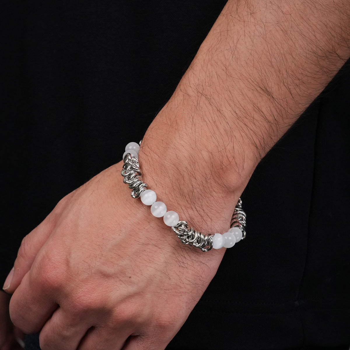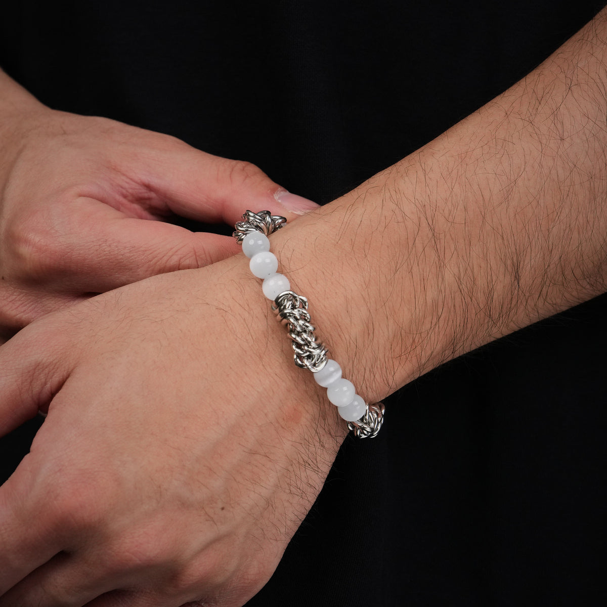 Albus is a tactile piece that plays on contrast — combining soft, moonlit cat’s eye beads with thorn-like clusters of stainless steel. The result is a bold yet poetic bracelet that channels organic strength and quiet rebellion.