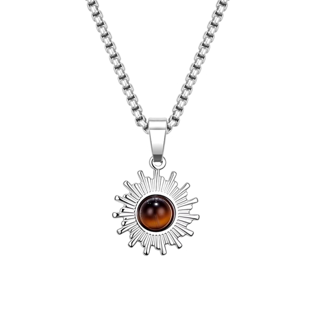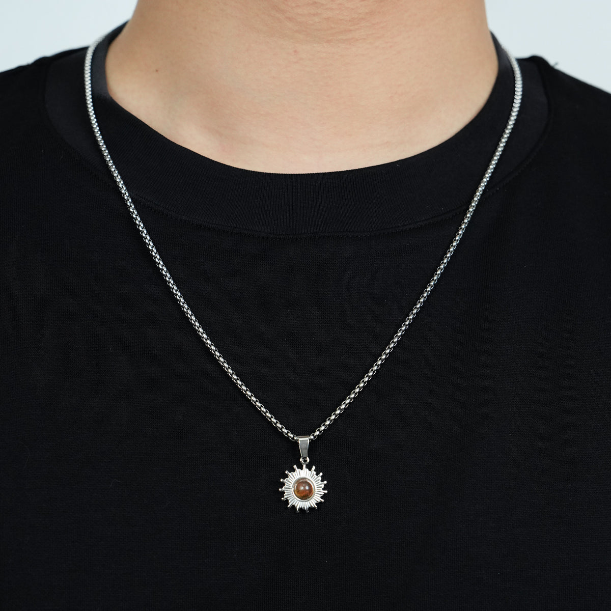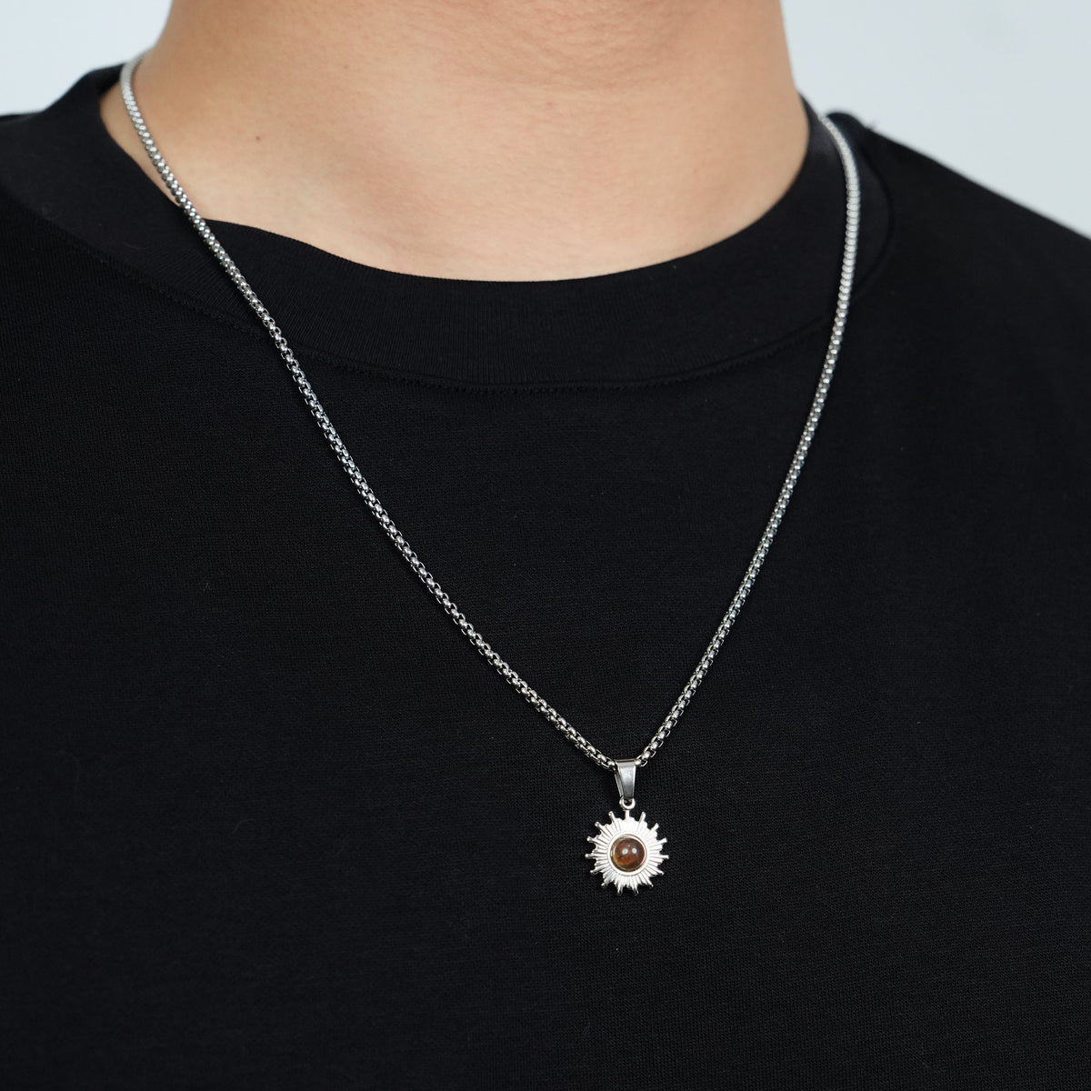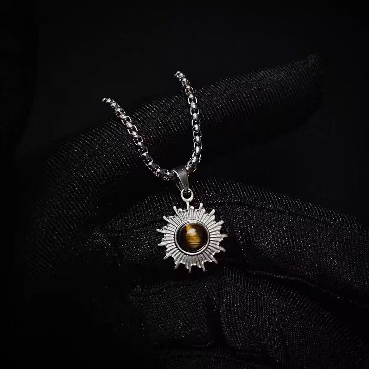 Forged in light and rooted in legacy, Cyrus is a pendant necklace inspired by the enduring image of the rising sun. At its center, a tiger eye stone glows like an ember — surrounded by a burst of finely sculpted rays in polished steel, balanced by a sturdy round box chain. The piece blends celestial reverence with industrial clarity.