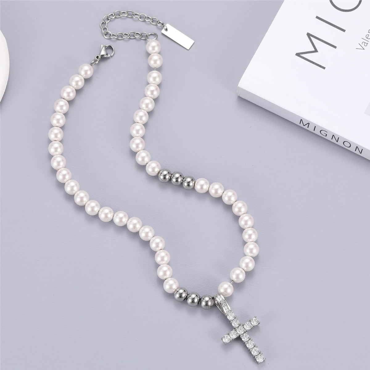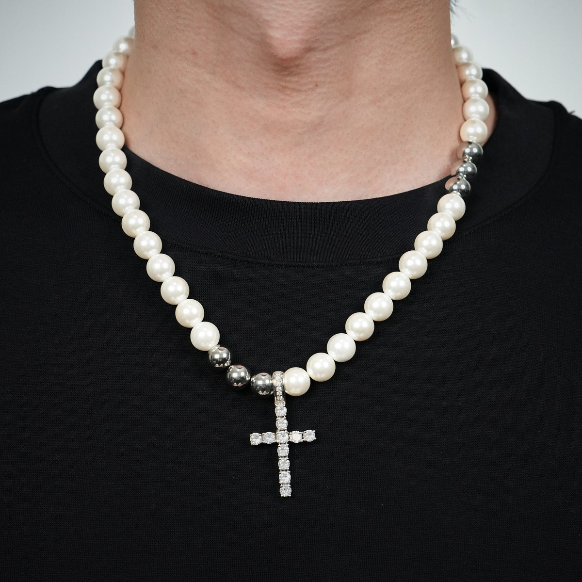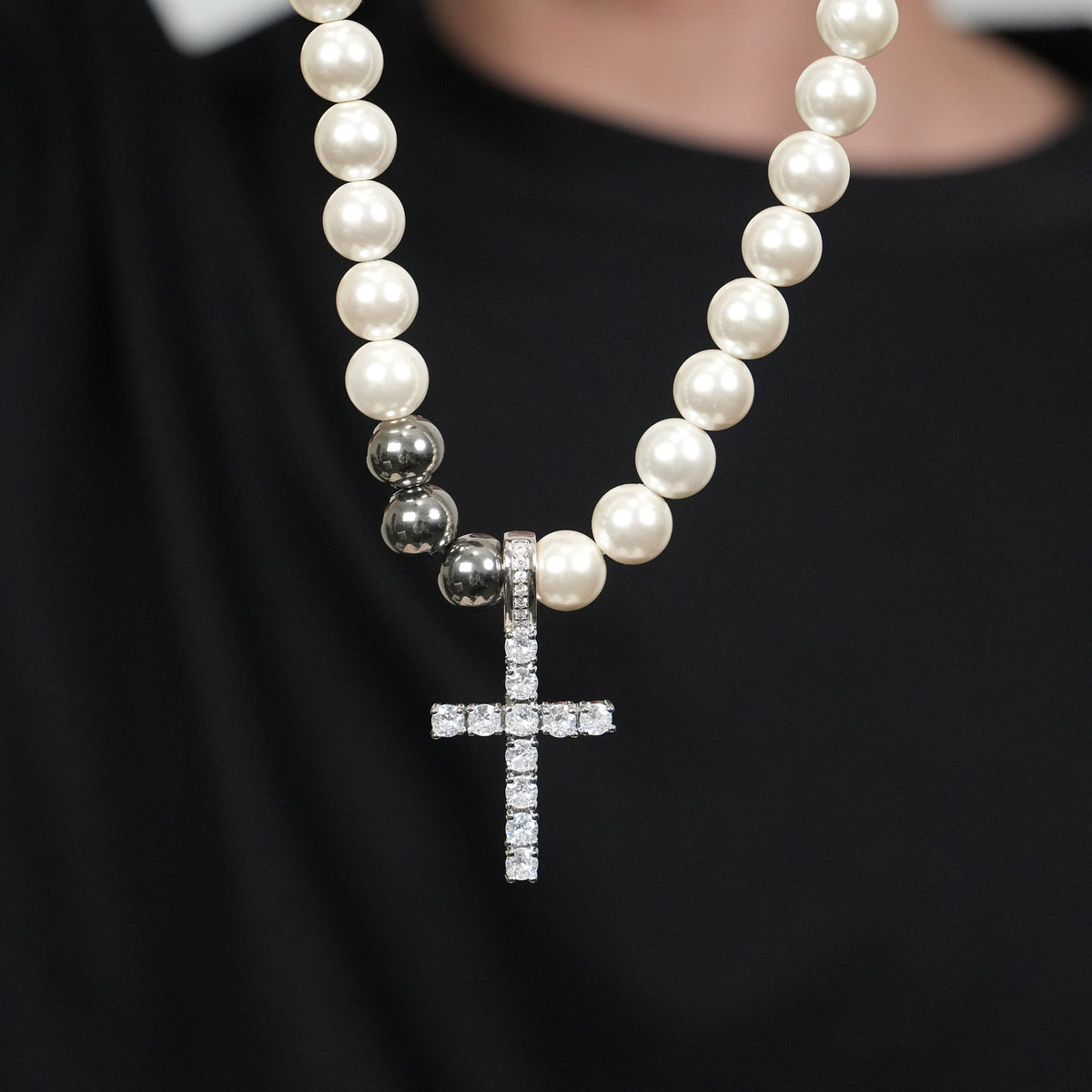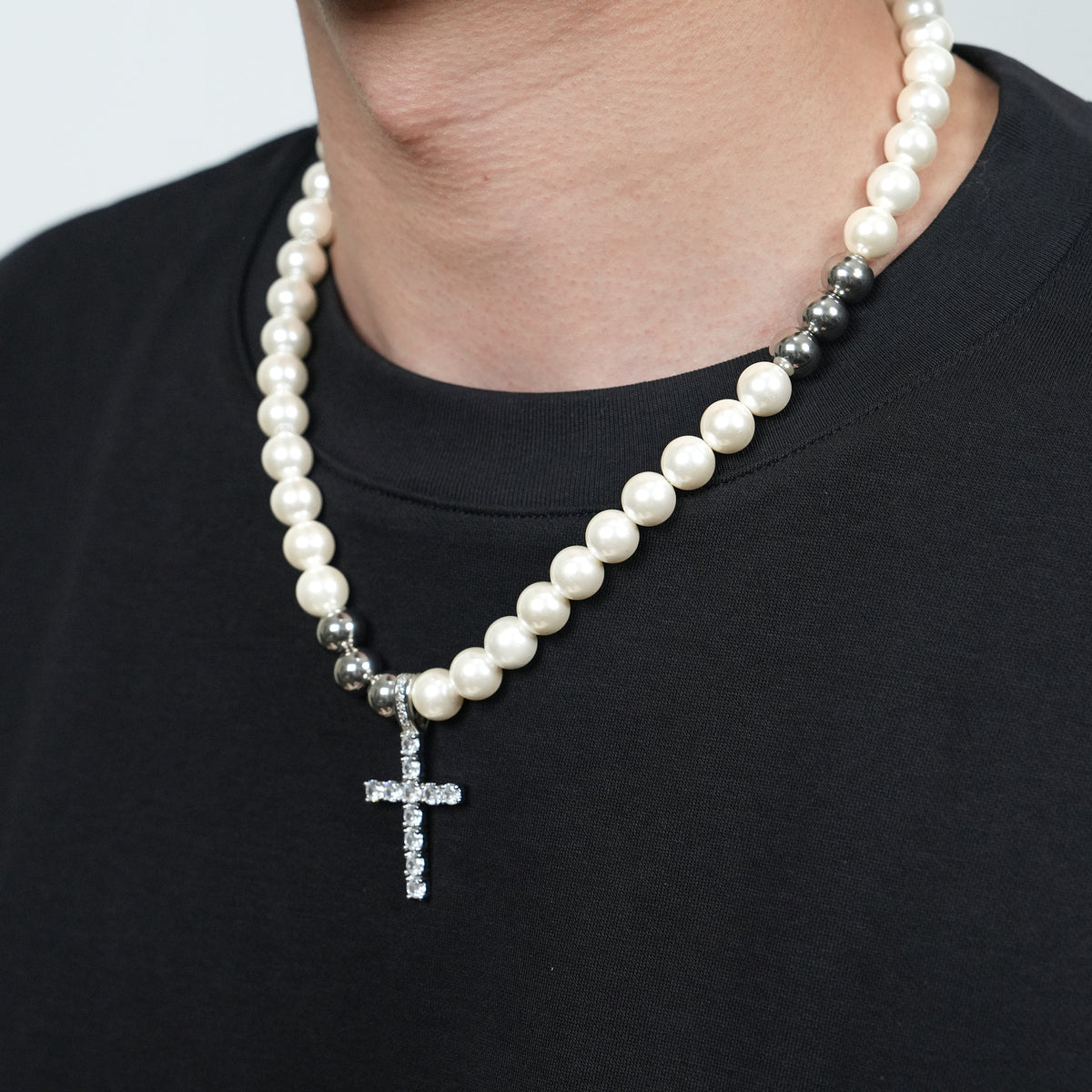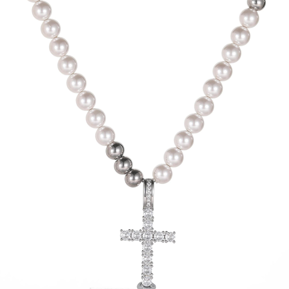Elias captures the balance between modern devotion and timeless ornament. Featuring a crystal-studded cross pendant suspended from a beaded chain that alternates between luminous white faux pearls and cool-toned stainless steel spheres, this hybrid necklace redefines classic elegance with edge. The structure of the beads draws the eye into the center—where a radiant cubic zirconia cross becomes the anchor of the composition.