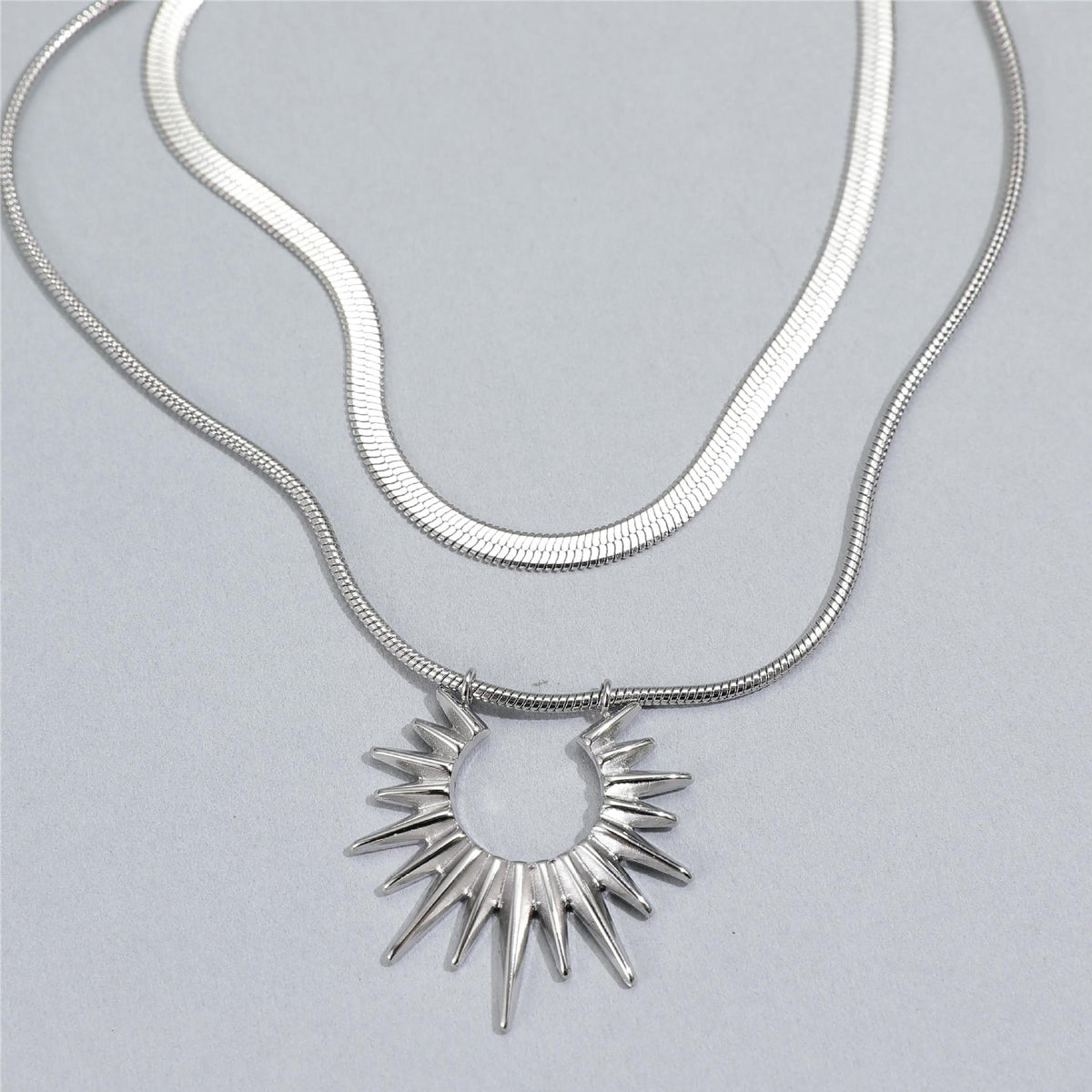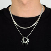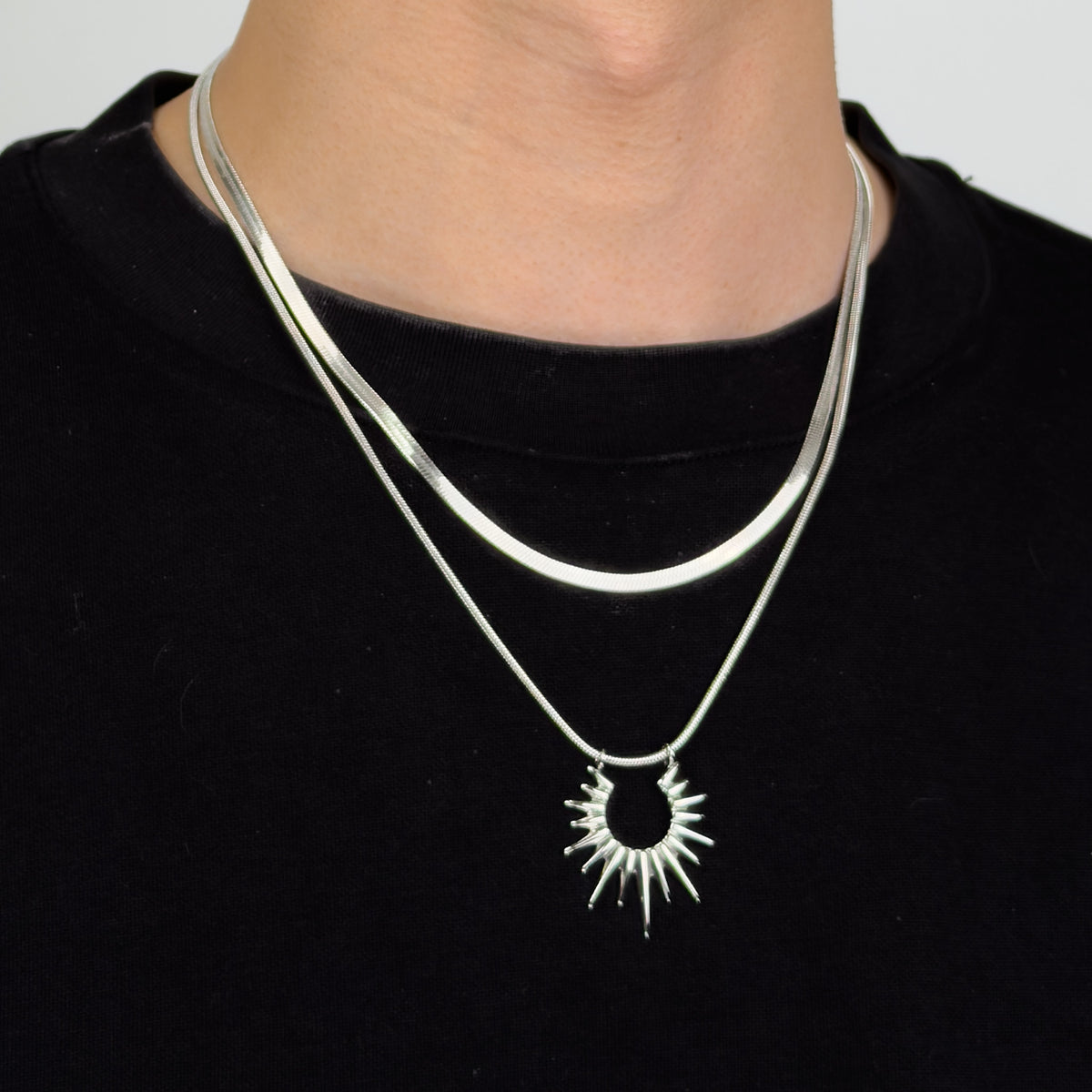 Osric is a two-piece layered necklace set composed of two asymmetrical snake chains: an upper 3mm flat snake chain, and a lower 1.5mm round snake chain with a sunburst pendant. Both chains can be worn individually or layered together to create bold structural contrast. The pendant’s radial geometry symbolises light and order — a clean, modern emblem designed to anchor any look.