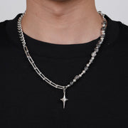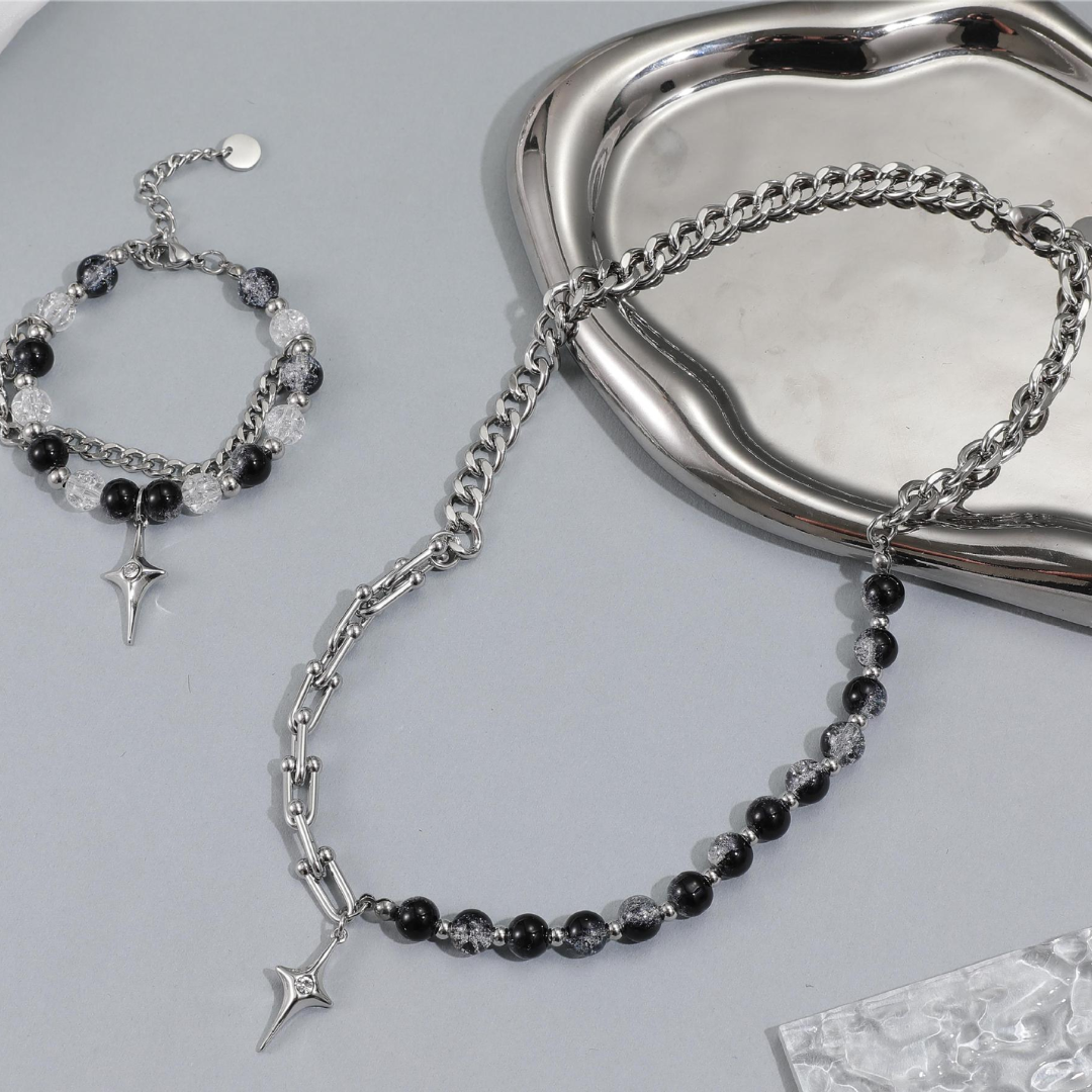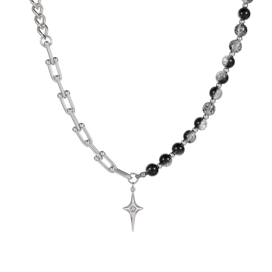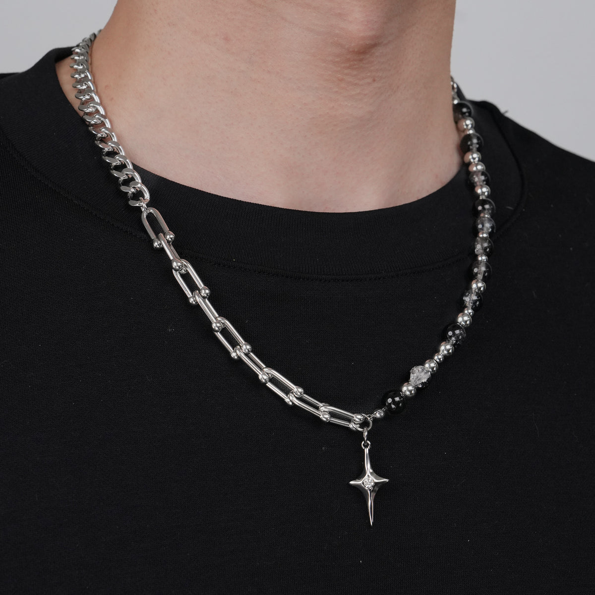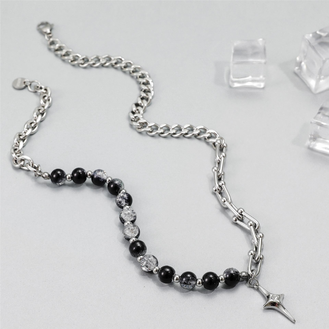 Veyra is a cosmic-inspired bracelet that balances texture and tension β pairing shatter-textured crystal beads with high-shine stainless steel orbs and an off-centre charm shaped like a falling star. The layered dual-chain detail adds depth and edge, giving the piece a structured yet fluid silhouette.